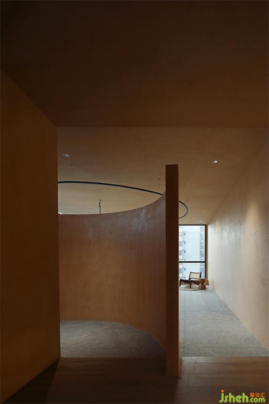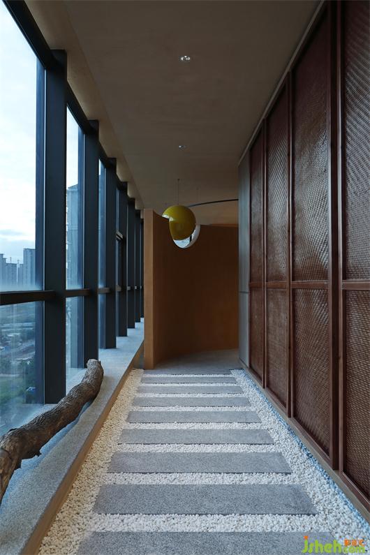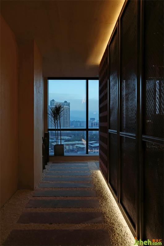 过廊透过尽头的玻璃窗巧妙引入自然光。原木材质是这一区域的材质基底,与石材质、自然光交织