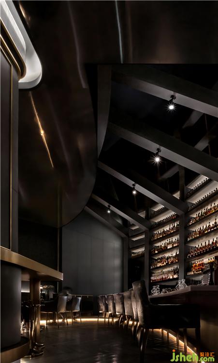 场景空间由一层半的架构关系组成,DDID鼎点设计团队希望用一横一竖的网格线建构整个空间设计的主题,威士忌餐吧设计表现出现实与虚幻之间的关联性,从而彰显物象张力。线条的延伸与交织,以一种不规则的空间形态出现,像自然围合与掏空,挑战人们既定的建筑价值观和被捆缚的想象力。