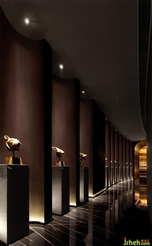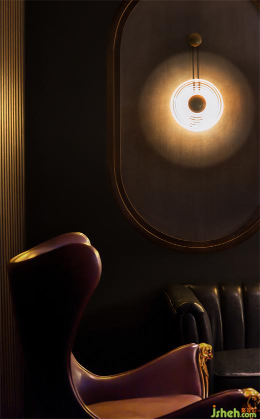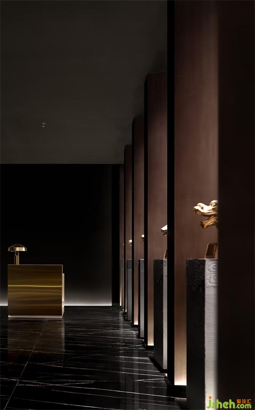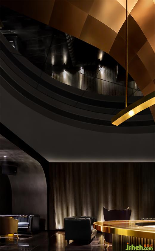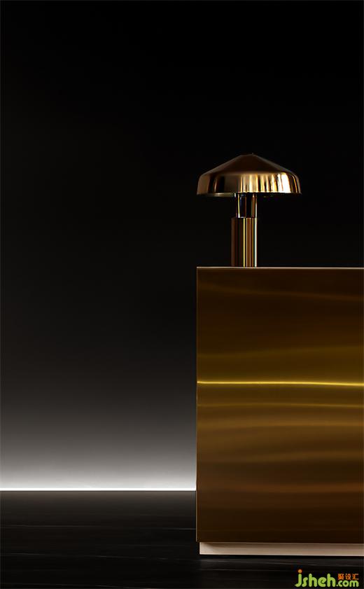 肌理漆较低的灯光反射于金属上,形成了环境光渲染的对比,丰富的面层凹凸质感能赋予场所较好的感观情绪。