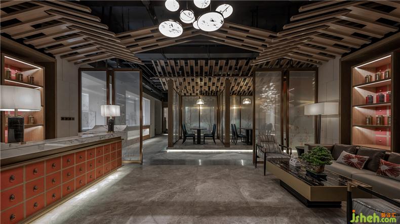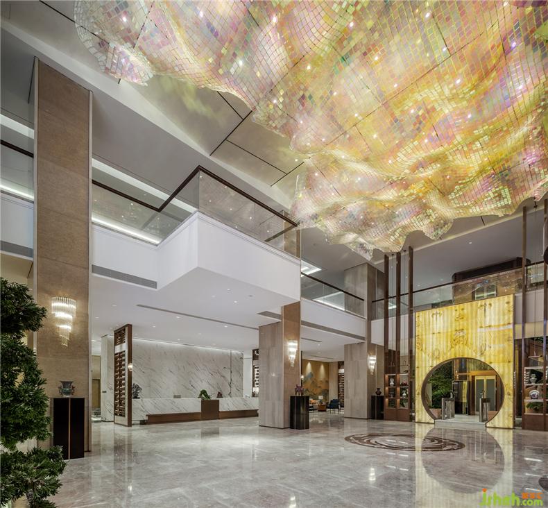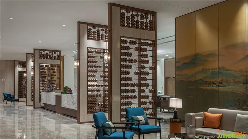 进入大堂映入眼帘是凌空壮似涌动着的水晶吊灯映衬于空间中,似星光点点,璀璨斑驳。装修设计算盘式的隔断屏风分隔了大堂与休息区,木质算珠成串铺排,极具古朴典雅。千里江山图在沙发区背景静静流淌着光彩,组成一个大空间的基调:一虚一空灵,一实一庄重。配合着大厅播放的“千里江山图”及新东方企业兼顾人文文化及企业文化的介绍宣传,调动着视觉感官和听觉感官。