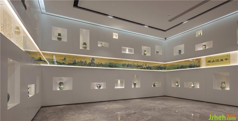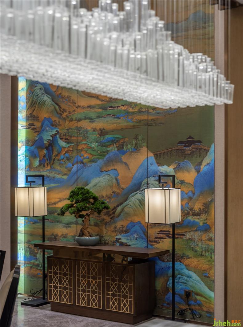 我们把传世之作《千里江山图》采用素有国宝之称的汴秀进行一比一还原展示缔造空间的瑰丽,绒彩夺目,名绣佳作,竞相生辉。以汝窑和官窑的元素以彰显简美思想,每一件器具皆是精心挑选,体积、颜色、纹理等不同形态的呈现对空间美感的萦绕。