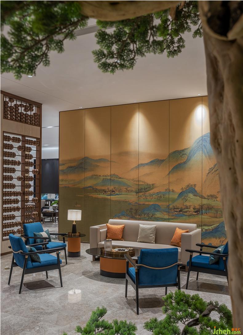本案设计以宋朝的文化意识形态和思想价值为主题核心,通过宋代大师王希孟所作的十大传世名画---《千里江山图》勾勒整体设计的创作灵魂,于不同楼层之间细化主题和融入宋词、书法、花鸟、瓷器、交子等设计元素,《千里江山图》丹青千里,装修设计咫尺亦有千里之趣,以长卷形式描绘了连绵的群山冈峦和浩渺的江河湖水等,描绘精细,意态生动,把祖国山水的雄奇和壮丽挥洒出了一种雄浑、豪迈的气魄,从中寓意新东方村镇银行未来蓝图千里江山的宏愿,在最美的年华绘制最美的图卷。