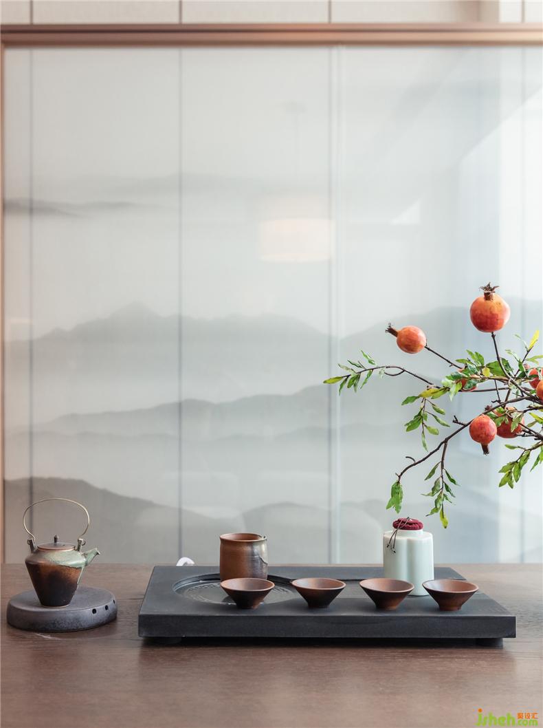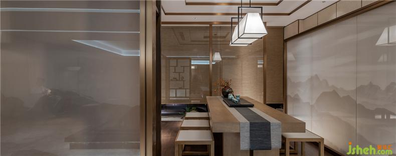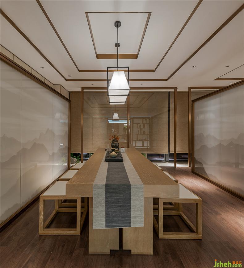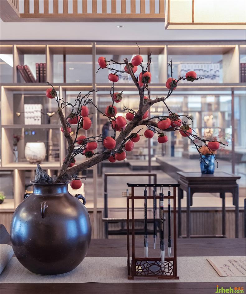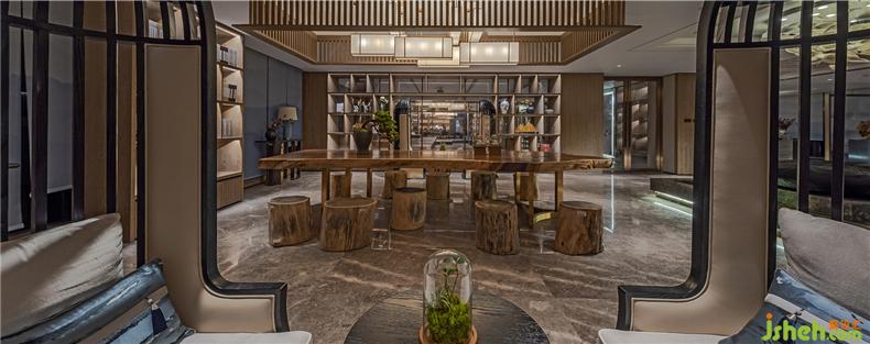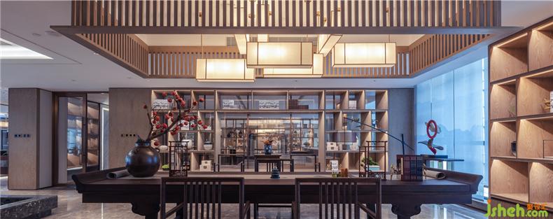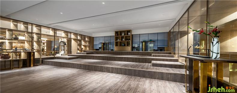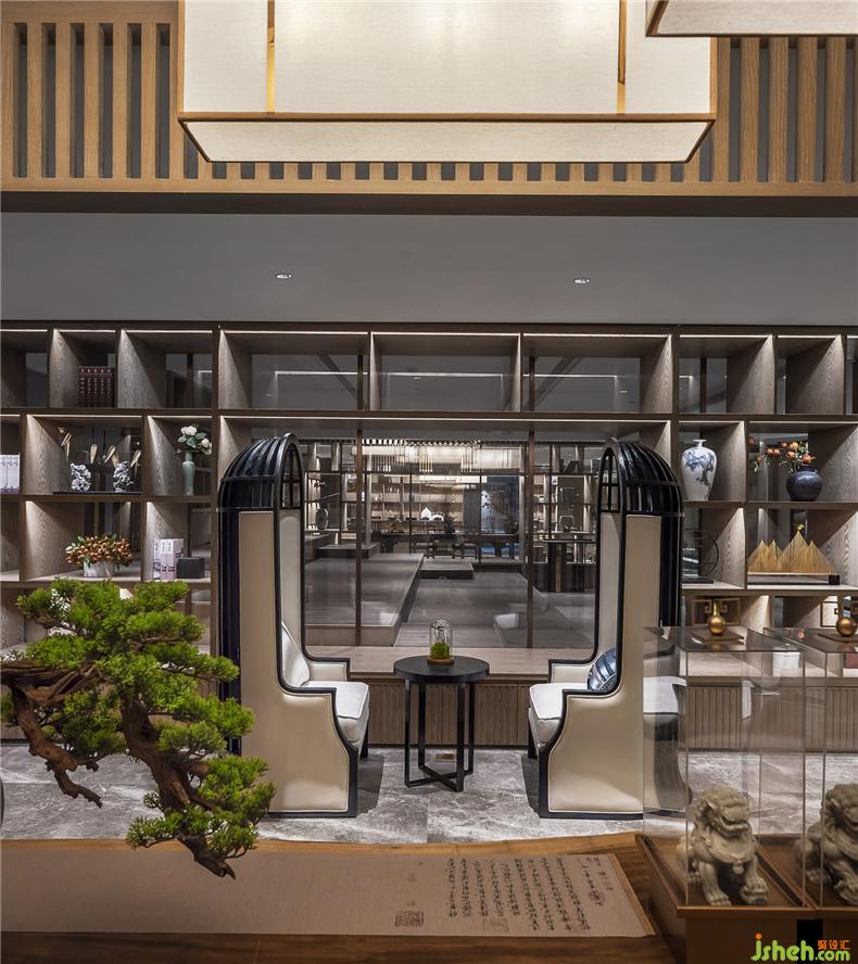 相教于五层,六层更偏向于休闲型交流中心,除了会议室还设立了茶艺室、书吧、朗读室、咖啡厅,空间布局井然有序,隔窗造景的艺术手法在这里淋漓展示。不同的分区多以过道相连,装修设计水石小池的置入使空间在貌似冷峻之中多了几分隽秀灵动。中式的桌椅、灯具仍于四处可见,大理石柱上饰有挂灯,古色古香。