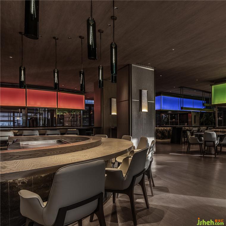 首层明档散座区空间,每个岛台以不同颜色标记菜式——广州花木棉红代表广式烧腊;樱花粉红代表日式铁板烧;茉莉的绿色寓意江南冷餐;金黄标记北京烤鸭等。龙庭酒家设计大胆的色彩运用将就餐区嵌入戏剧化背景中,明档厨师更像是舞台中的演员,体验层次大大丰富,而素色环境中的高饱和RGB色也能够刺激食欲和情绪。