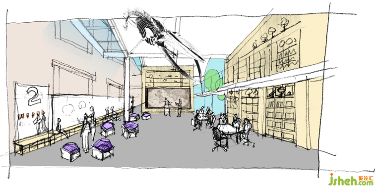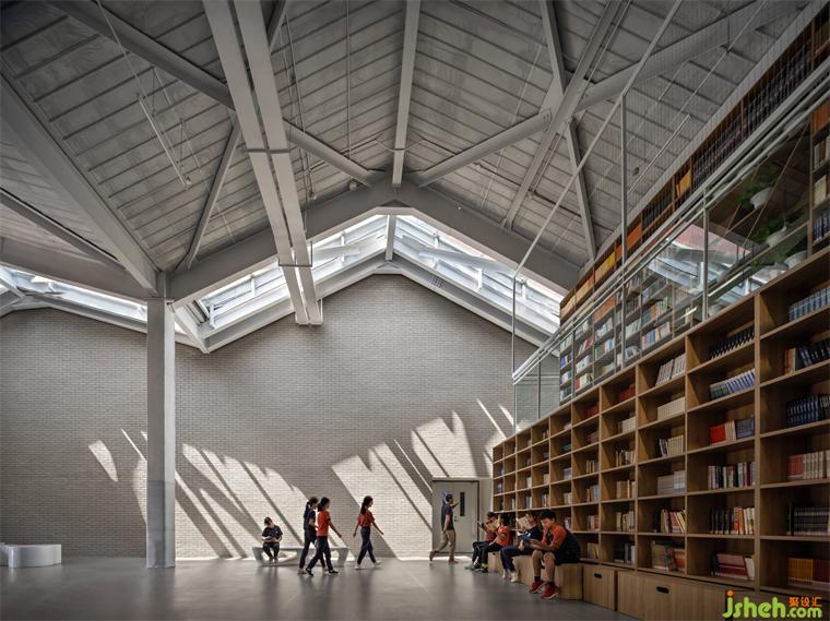 所有教学空间围绕两个大型中庭展开:入口中庭更像一个开放式的图书馆,双层书架的灵感来源于600多年前的牛津图书馆。演讲广场中庭既连接上下两层,也延伸了教学空间,同时,甚至公共的演讲也可以在这里展开。学校装修设计屋顶散布的多个天光,一起让整体建筑灵动而明亮,上下自然联通,呈现出动态的内部空间。