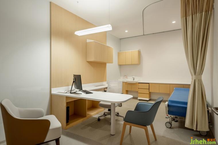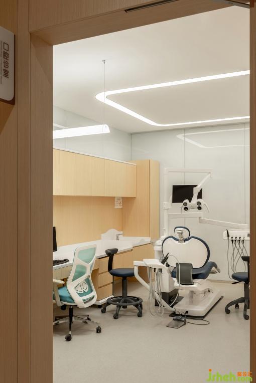 在独立的国际医疗部主入口,由外而内的空间组织有影壁和一系列空间暗示,让患者与客人感受到私密与尊贵;楼层内诊疗、交流、就餐与休息空间皆以书架、屏风、花艺等手法做软分隔,结合动线处理,既保证空间联通、使用高效又做到适度私密。