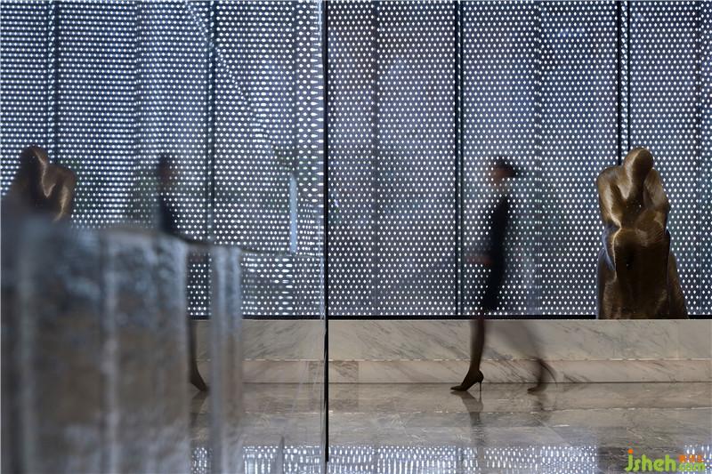 入门,一面高级复古的砖材与清冽透明材质相组合的“城墙”迎面而来,通过材质、纹理、自然光线的变化,展现出复古又不失精致的设计。设计中不同维度、新旧元素碰撞互融,在碰撞中,逐渐感受历史文化背景的延伸。