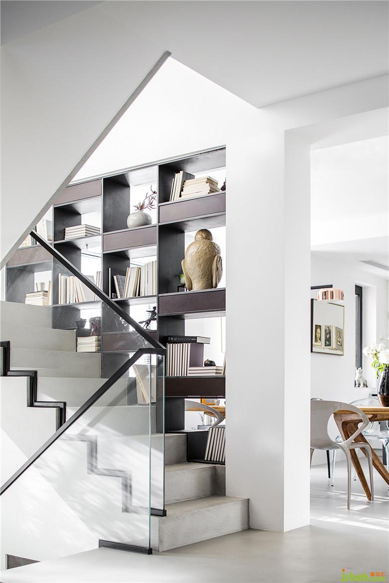 大面积纳米水泥的运用,高级的灰色塑造出大气而连贯的空间;定制的锈浊工艺金属书架,从一楼延伸至地下一层,让两层空间紧密相连。