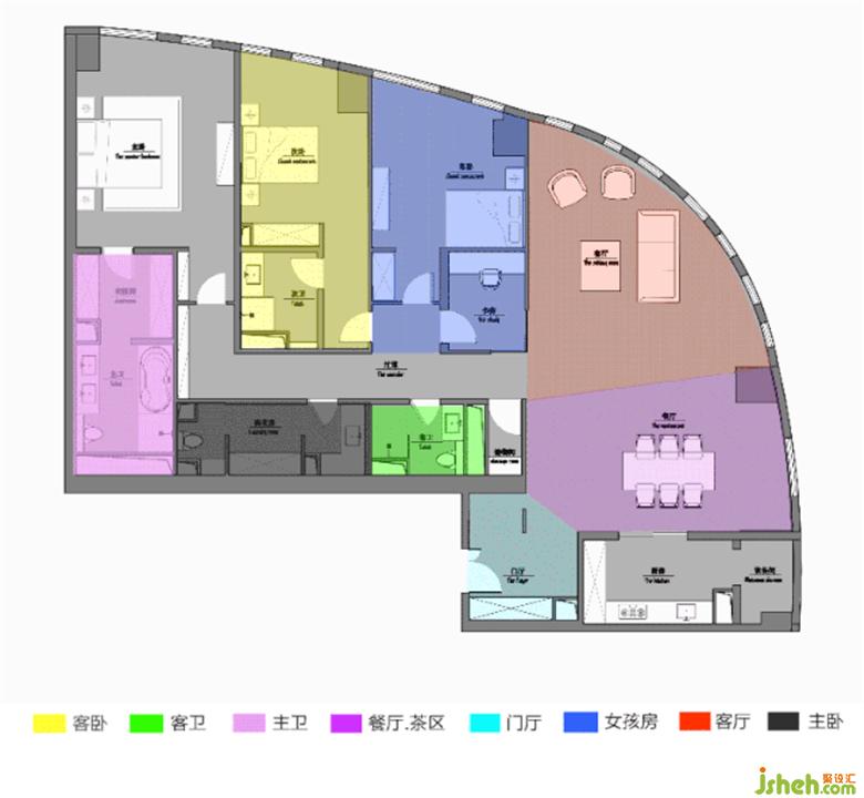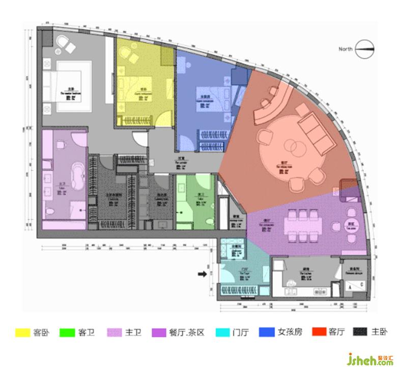 1、把空间从固有扇形结构的束缚中解放出来。平面呈扇形,室内大量弧形和非垂直的转角对空间的利用造成诸多限制,按照惯性思维,是无论如何都会出现让角落闲置的情况。但是,我们坚信206平方米的不算小的面积为解决难题提供了可能性。
