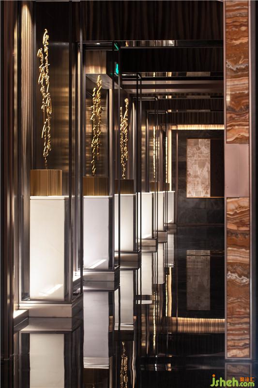 作为会所的第一空间,设计为确保私密性所规划的左右对称通道路径布局,在地面暗藏光源中以其内敛沉静的场景营造过滤掉了外部的喧闹与繁杂。玄关处通过现代石材表现的东方意味——“天圆地方”,在灯光的渲染中形成了“幽竹山窗下” 的诗意。独创《陶朱公 商训》艺术书法雕塑与不锈钢序列结构天花间的相互呼应,在传达了企业温厚稳重的人文印象的同时也为这无限的意境中做足了视线延伸。而每个房间门口的造型各异的灯具则以其温润之光静候贵宾,营造出淡然气韵。设计公司