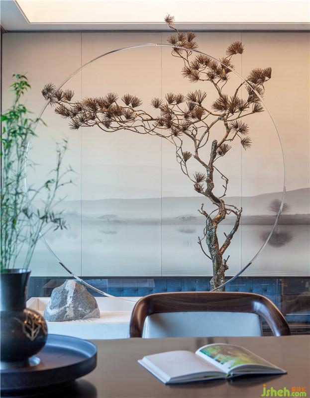 以茶待客,乃古代人情交际的礼节,它为友人之间带来一种清幽隽永的意境。作为与友茶话的私享地,我们以框景的造景方式,引入内置庭院概念,用枯山水加以诠释和白色石子烘托氛围,再将透明玻璃将茶室与包房视野联汇贯通,形成对景。踩石踏景步入,恰到好处的完成了过渡,也渲染出一种定神凝气的仪式感。草木嵌顶、中式传统边柜与枯藤装置等在此则转变为空间的表达语言,构建起人、茶、景、情、境间的存在与通融。设计公司