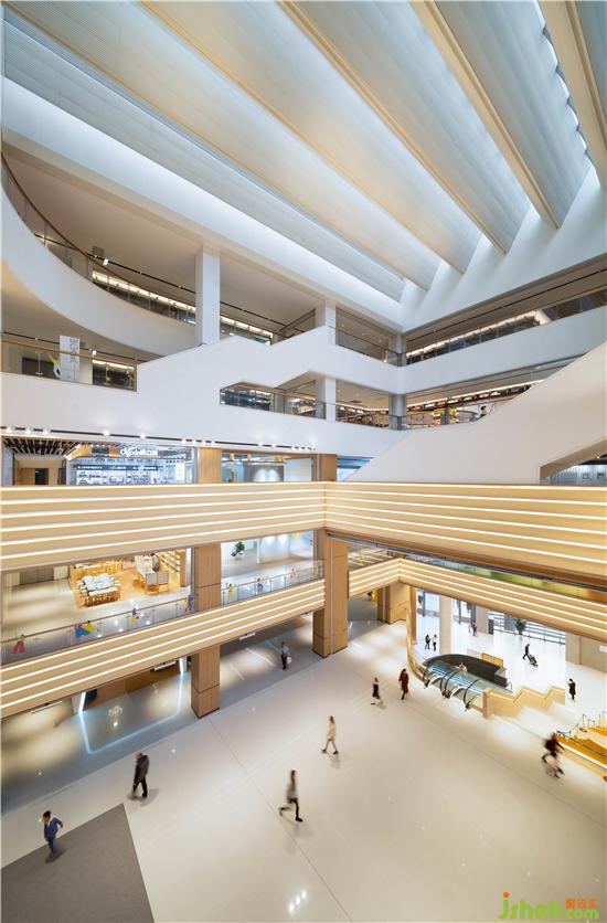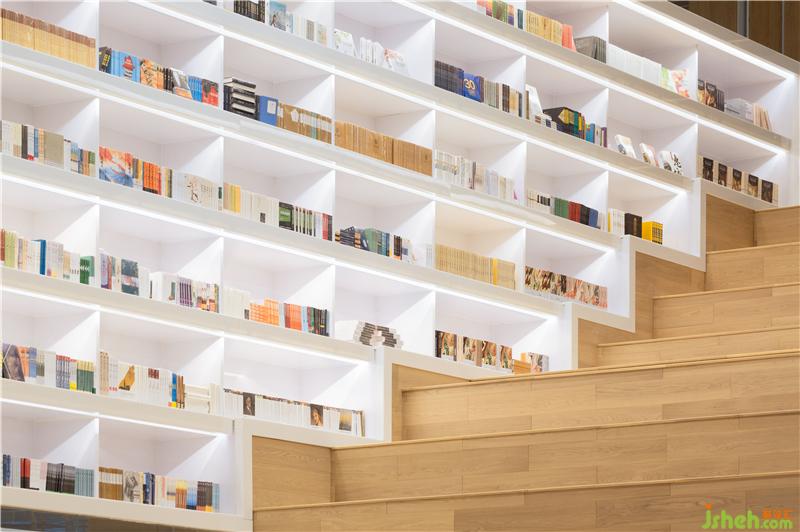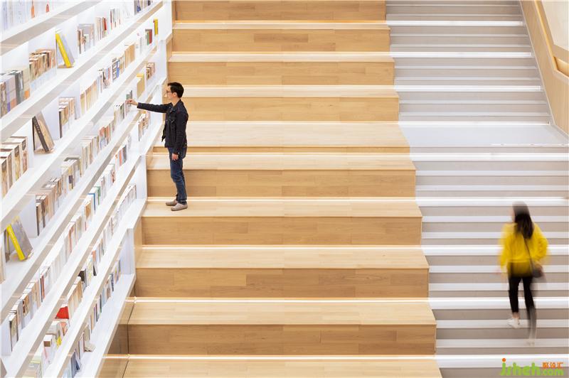 二层是书城的中心城市客厅,这不止是沉心读书的理想之地,还是根据需求而变的核心文化平台,或是崭新的多媒体展示空间,在此通过承办各种文化、演讲、论坛等活动,为书城和读者之间搭建起艺术交流的对话空间。高达四层,宛如层层垒砌的“书山”中庭造型,直通天窗,将“书山有路勤为径”的景象展示在读者眼前,自然天光由“书页”状的玻璃与隔板的天窗中倾洒而下,留白简净的色理与类木材质的交融,使得整个空间温馨中带有一面“现代静谧”;与此同时,柔和的阳光也极大的节省了建筑空间能耗,进一步契合绿色生态的设计理念。