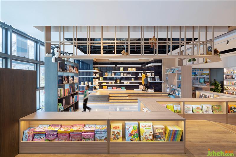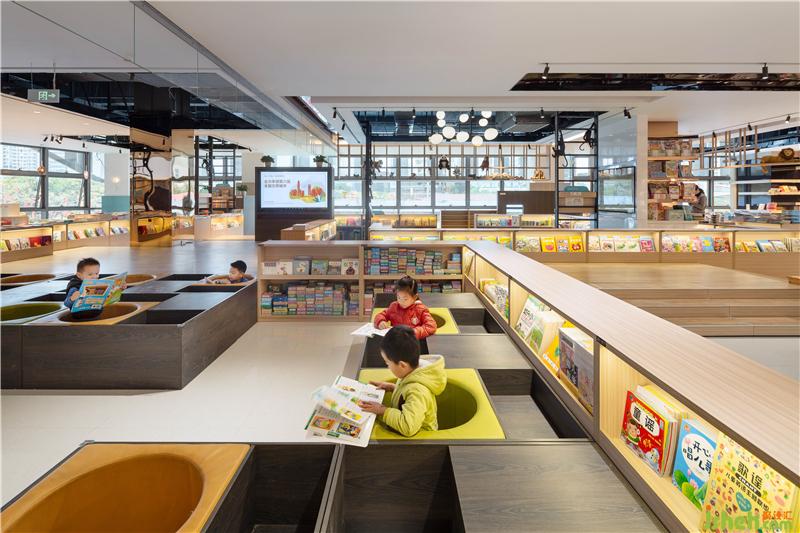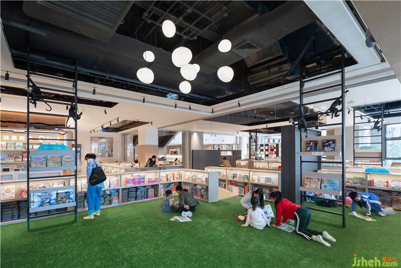 我们希望以孩子的视线出发来打造一处他们心中的乐园,所以将“微社区”的概念植入空间,构建社区元素的多样性,通过多元化和多功能的空间组合启发孩子们的创造性。在阅读场景设计上,我们充分重视其主人翁意识,以符合孩童身高和浏览习惯的书架/不受拘束的草坪时阅读园地、灵活的积木拼接式阅读卡座、趣味十足的站立式穿梭洞洞设计,在为孩子打造专属而舒适的尺度空间的同时也赋予孩子们思考与动手的能力和赋予家长与孩子于不同场景的视线交流。书城装修设计