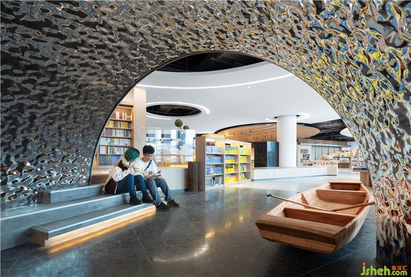 Materials in interior design is important. At the Cultural Hall, we express the calmness of reading environment through metaphor of bridge over water, by using a wooden boat and rippled chrome surface.