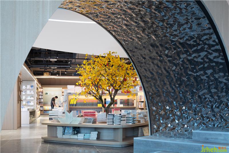 在我们看来,材料与构造的准确运用对于设计理念的形式表达有着同等重要的意义,所以在对于“小桥流水”这一空间概念的塑造上,我们用波光粼粼的镜面金属营造出桥背凹凸“水面”的直觉观感,同时在桥底摆置木质小船与之形成上下意境呼应,传递出雅致自然的空间画面感,让轻松愉悦的阅读氛围如小桥流水般走入人心。书城装修设计