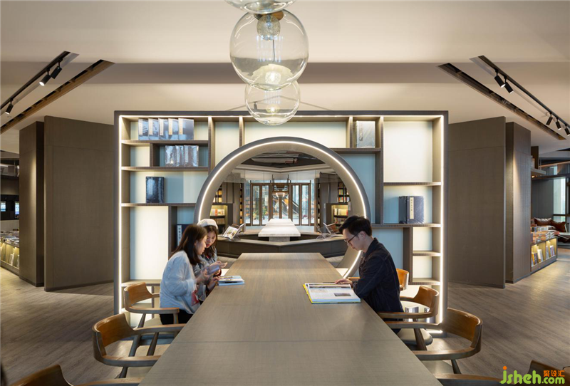 以水平、线性视觉为主的艺术馆区域,我们在局部空间造出圆形的框景形态,并通过丰富交织的立面层次,营造出“曲径通幽处,禅房花木深”视觉感。不仅如此,材质的自然肌理附着在书柜及书台的简约形态中,自然营造出柔和温润的阅读氛围体验。在这里,一书一阁,一墙一窗皆是风景,在方、圆结构的交错中瞥见人们于中行走、找书、阅读的行为活动景象,于方圆之间自得,于「景中景」中体验质感生活。