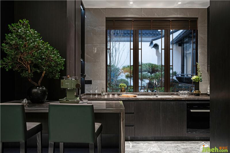 客厅中墨灰与星灰的深浅交织,加之古朴小品的点缀,铺叙一室优雅有度的气韵。大面积的窗框亦是景框,将庭院的自然风物引入视野之中,景与境相辅相成,宅院合一,意蕴相生。