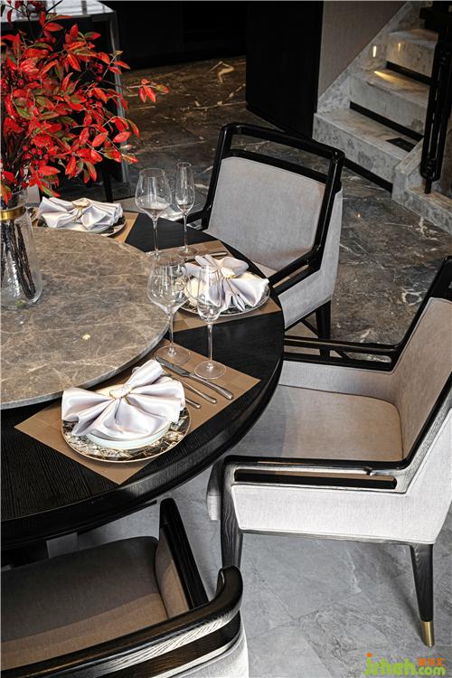 在设计师笔下,适应当下时代的东方美学是令空间与生活实现艺术化联结的关键。一面墨迹山水的屏风,以徐徐展开的氤氲意境,铺就餐厅的调性。古制灯笼在当代线条的简化下,堆叠为一组艺术吊灯,与客厅灯饰遥相呼应,构就对称之美。