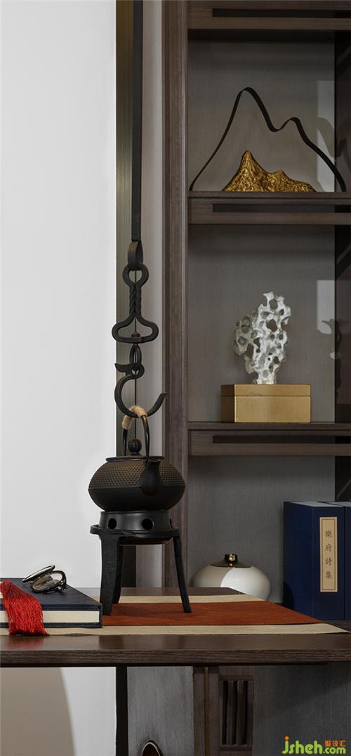 松之风物,清心雅静,与朴拙木架、精巧小品、留白画卷于空间中并置,光影摇曳之间,让人感觉清气自来,顿远凡尘襟怀。