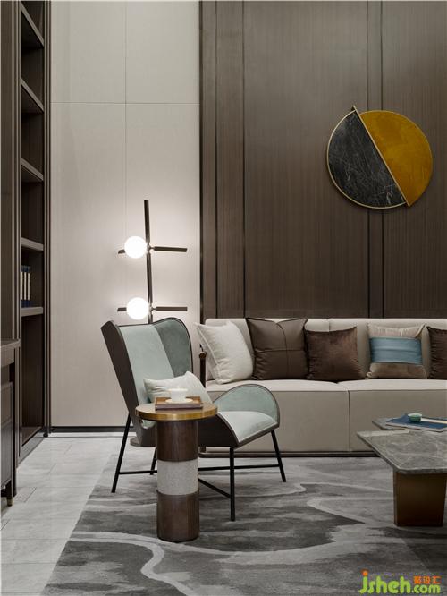 无论是从其呈现的风格美学,还是赋予人的极致体验,吕邵苍设计在人文生活情景上的深度打磨都值得赞叹。在负二层会客厅,设计师赋予空间场景以灵动的诗意 —— 一池春水汇于线条蜿蜒的扪布之上,与苍翠的松树端景、不规则走线的雅灰地毯形成虚实的映衬,以一种返璞山水与林间的自然意境,实现私密会客、亲朋畅聚的休闲空间。
