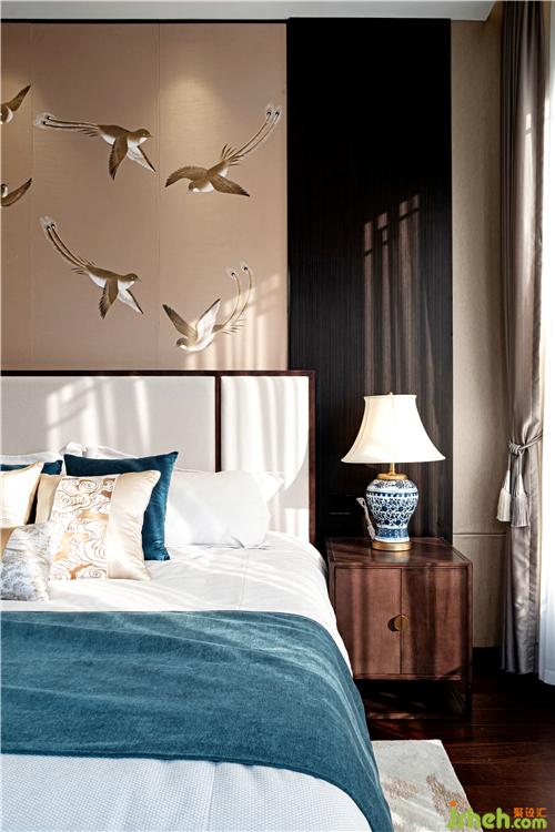 摒弃常规东方元素的杂糅,设计萃取文化之精髓。老人房的设计中,设色依然以沉静的靛青色为陈设调荆州样板房设计,青花瓷瓶、迎客松的摆设即刻重现了一个古典且安静的人文休憩场景。