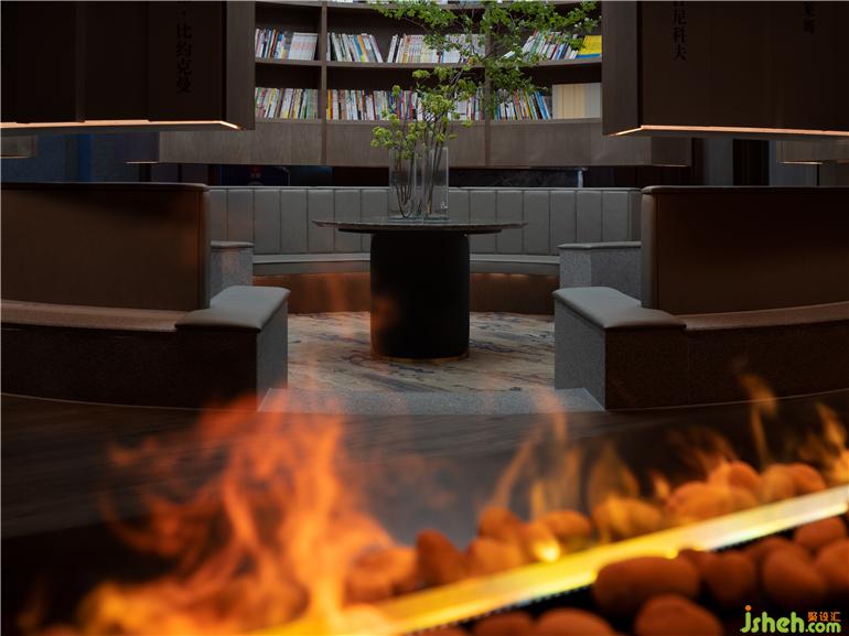 在一处高端的水疗中心,围一间雅致书斋,是吕邵苍设计的神来之笔。水疗设计有澎湃热烈的火苗,烘托出一丝暖意;有清雅相与的绿植、养出一份心性;更有将经典名著的书脊放大、作为隔段的绝妙巧思,用以寄托君子清冷之情怀。