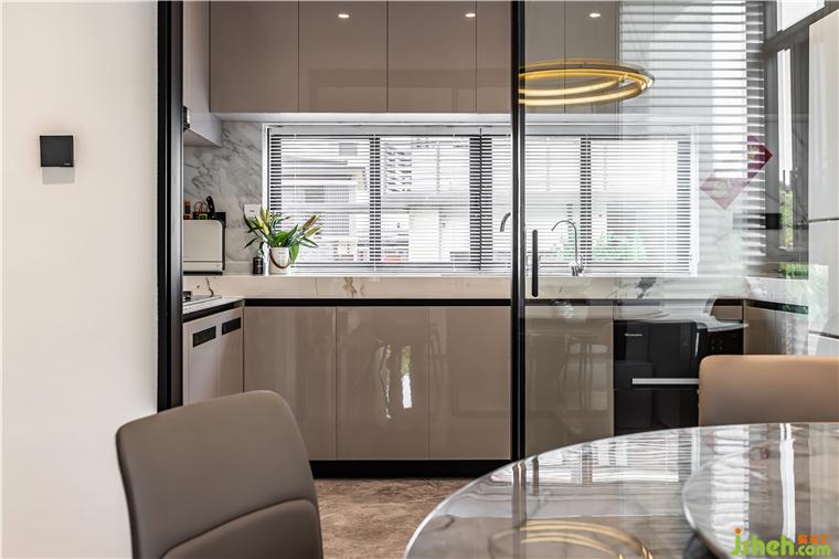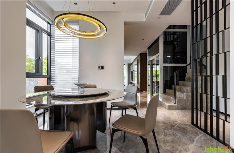中餐厅与中厨相近,为提升更多的社交属性,佛山保利云上别墅装修设计师把厨房门改造为铝框窄边门,并为空间量身打造黑色金属图腾屏风,极窄的框架线条让空间顿生美感。