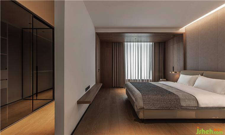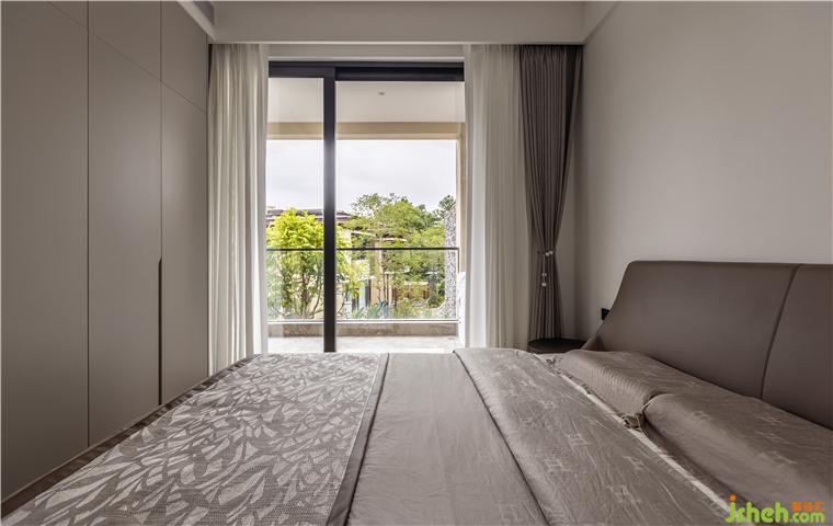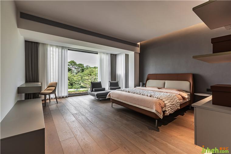 佛山保利云上别墅装修设计通过新置的钢构垂直电梯,我们来到建筑二层,二层是各自的私属空间。主卧在东南侧,设置了独立的衣帽间和卫生间,通过改造,很好地修饰了原本结构的不足。