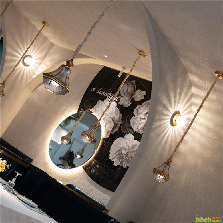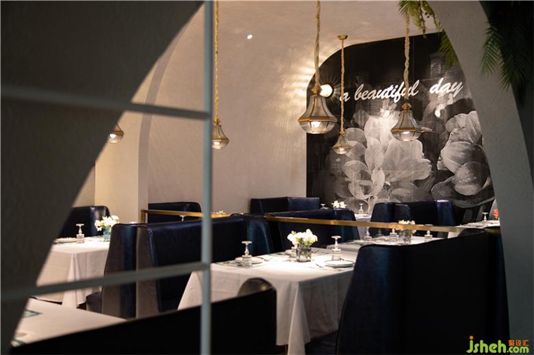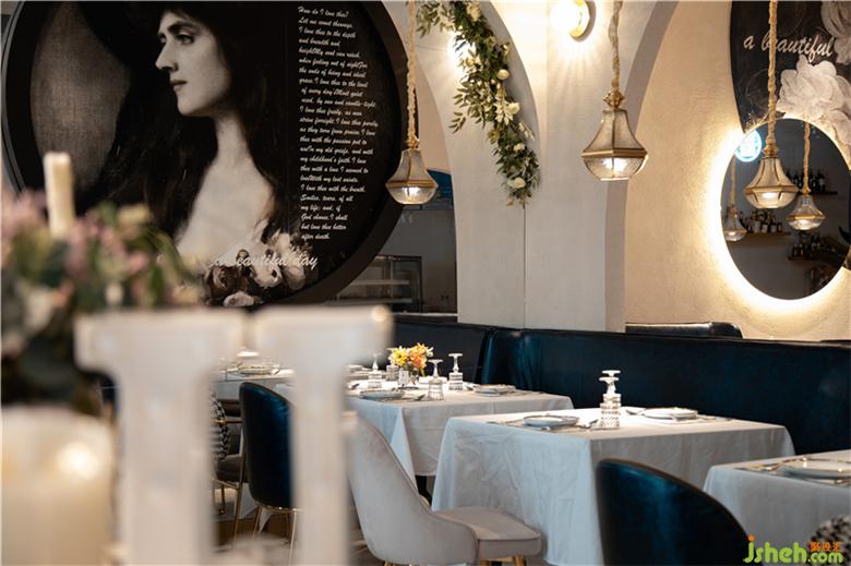 餐厅设计的天花借助于镜面不锈钢,形成富有冲击力和戏剧性的视觉效果。搭配现代欧式画艺,极尽简约之美。柔软的布幔装置的巧妙介入和运用,打造丰富的空间层次感与曲线美,结合复古吊灯氤氲出的柔和灯光,为整个空间渲染出了一种浓厚的欧式风情,让喧嚣城市背后,更有宁静感与仪式感,体现出自然浪漫的品牌格调。