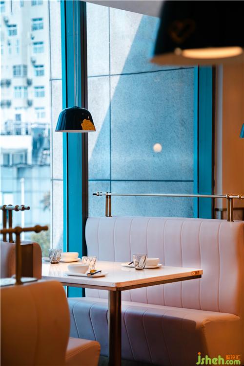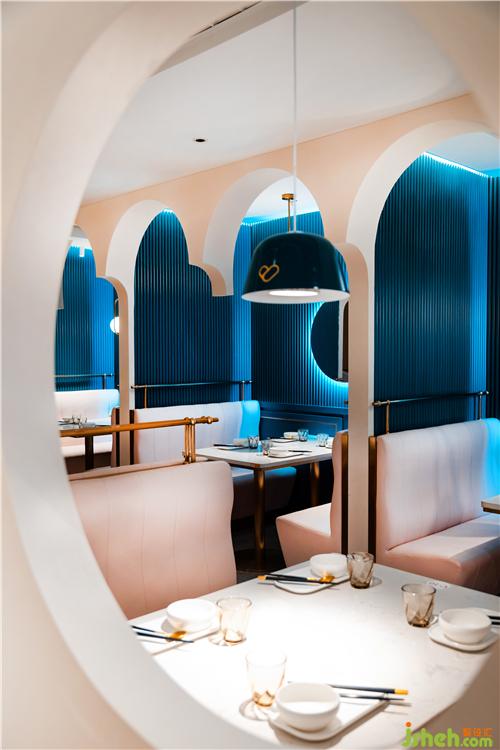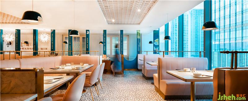 水纹不锈钢在室内形成一个充满流动性的天花空间,冲孔板拼接的"围墙"隔而不断,用几何之形表空间之美。不仅提升了餐厅设计的体验,也显示出对传统港式餐饮独特而现代的诠释。