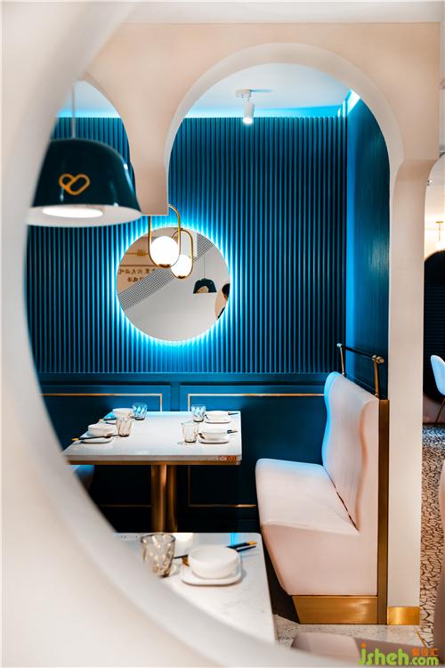 卡座区延续了整个空间的色调和材质,球形灯饰由天花顺着孔雀蓝色墙面洒下斑驳的光影,奠定了沉稳的空间基调。