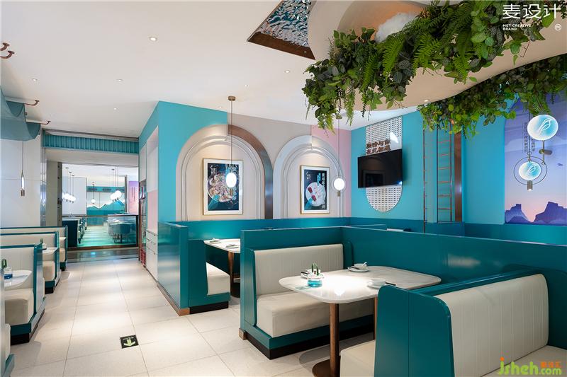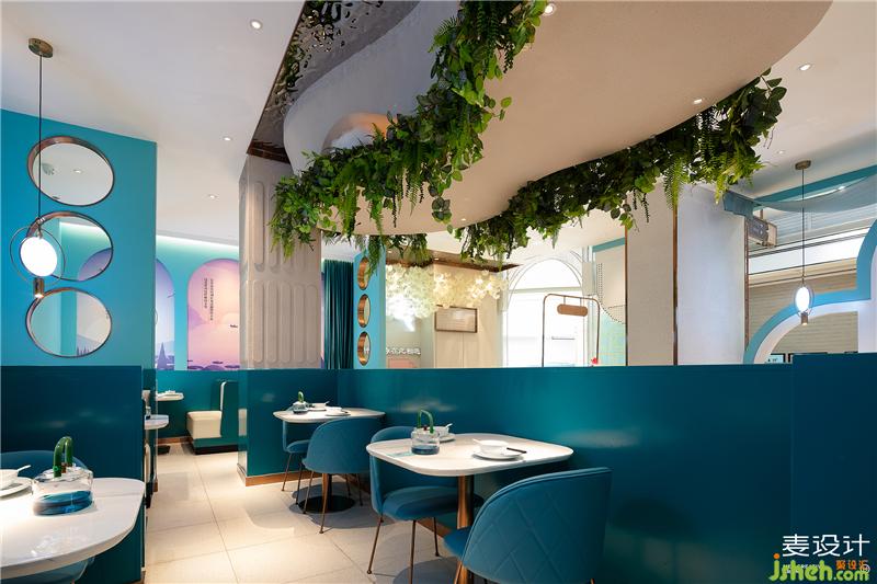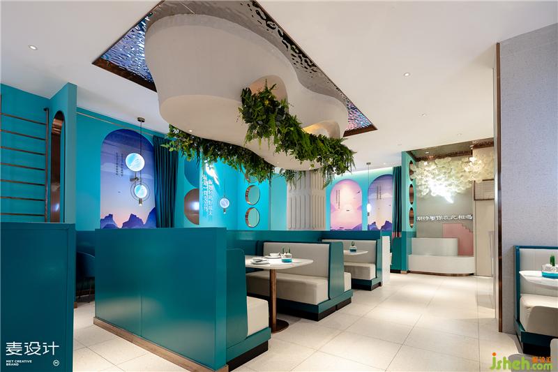 进入餐厅,消费者便来到了精致优雅、洁净浪漫的空灵之境。设计师用大面积的蓝绿色塑造空间格调,天花强调“留白”,营造出一种超凡脱俗、妙不可言的空灵之感。