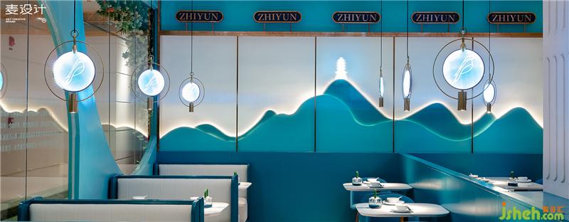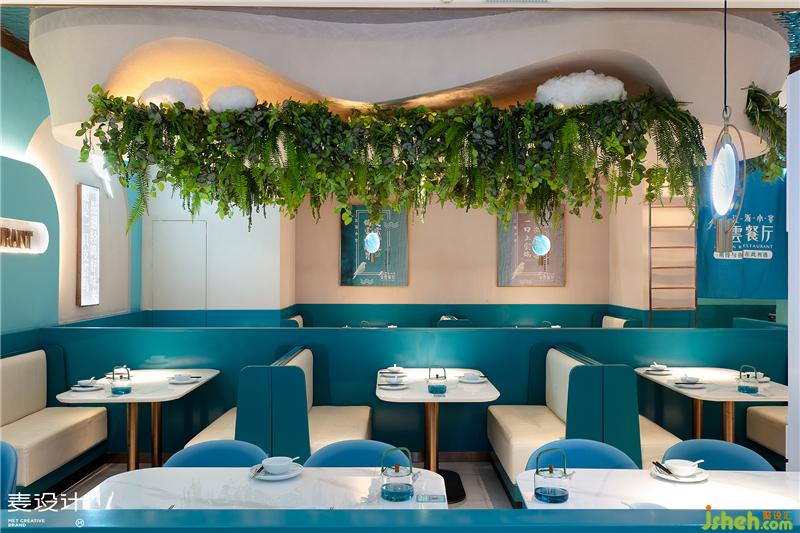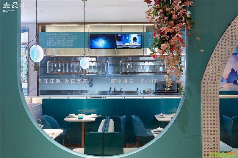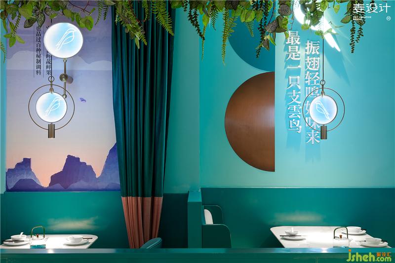 The purpose of this case is to create a casual and comfortable small banquet-style gathering environment and become a scene social restaurant favored by young consumers. Combining space application with brand culture, the designer extracts "Zhi Yun Bird" as the brand symbol and space soul, takes large area of blue-green as the main color of space, and creates a delicate, elegant and romantic ethereal environment through modern and simple design techniques.
