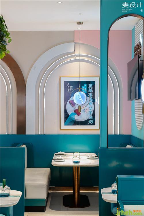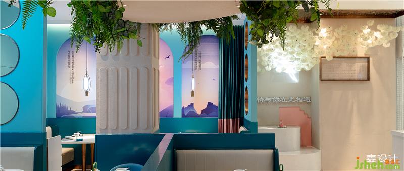Enter the restaurant, consumers will come to a delicate and elegant, clean romantic ethereal environment. Designers use a large area of blue-green to shape the space style, while ceiling emphasizes "leaving blank", creating an extraordinary and wonderful ethereal feeling.