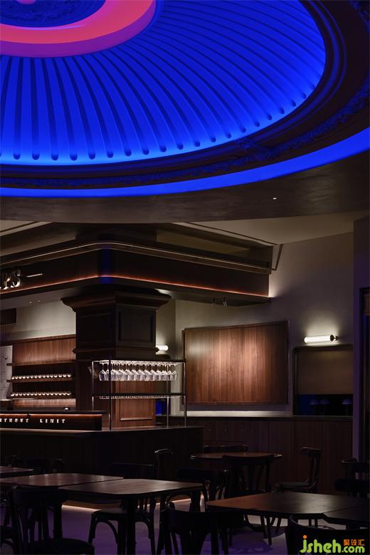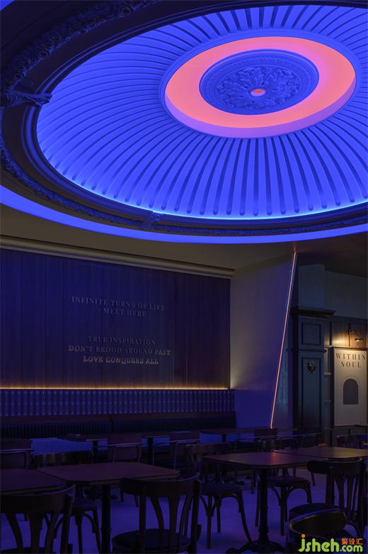 重叠并非交错,恰是一种并生不悖的和谐。自大堂中央环顾整个空间:胡桃木质的美式吧台、雕镂精致的欧式穹顶、中古家具、灯具以及经典千鸟格图案……西方古典主义不同时期的的代表性元素交汇于一域。