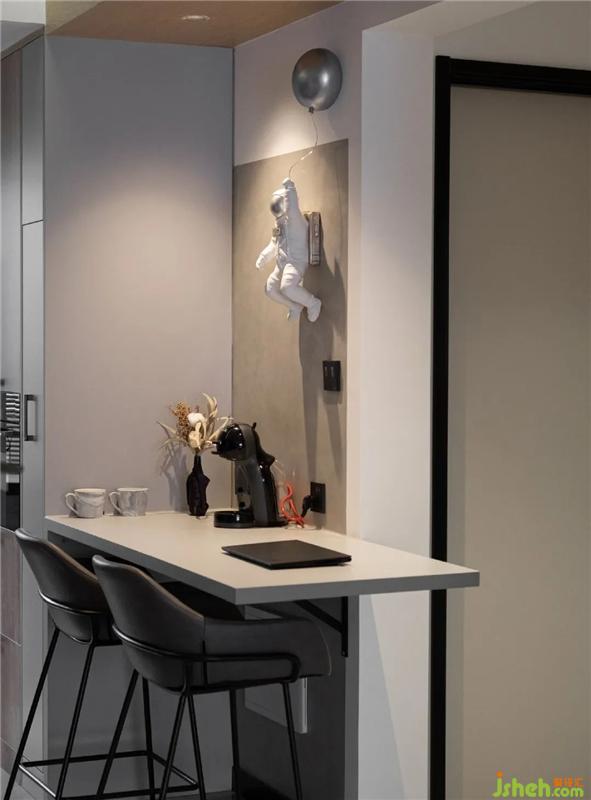 餐桌旁靠墙的吧台,作为屋主日常餐区的补充,增加了屋主喜欢的科技宇航员造型装饰。