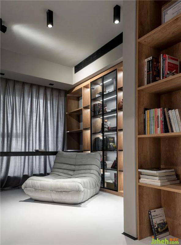 墙面做了整面墙的展示柜,灰色玻璃门与开放格穿插,桌子台面穿进柜子让整个空间更加整体,墙面隔音处理,顶面安装投影幕布让书房随时变成小型家庭影院,整体空间一面有窗两面玻璃推拉门的设计使书房变得更加明亮、宽敞、舒适。