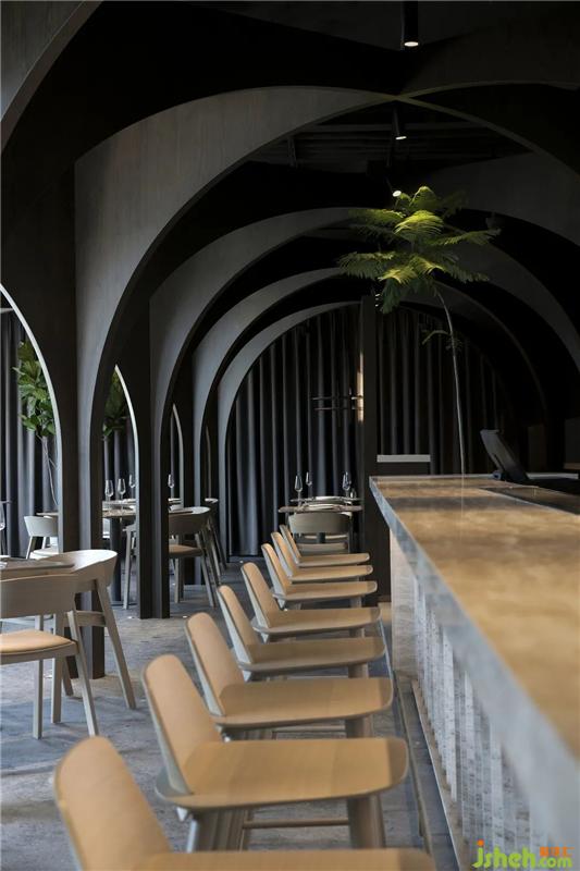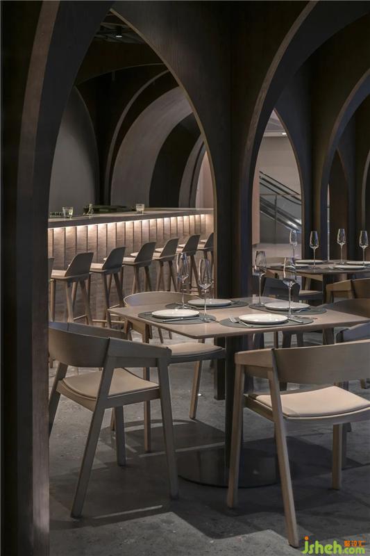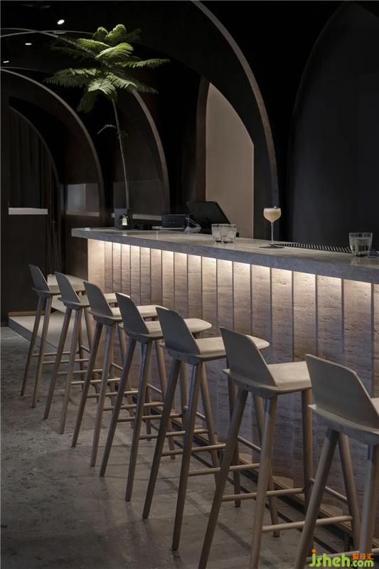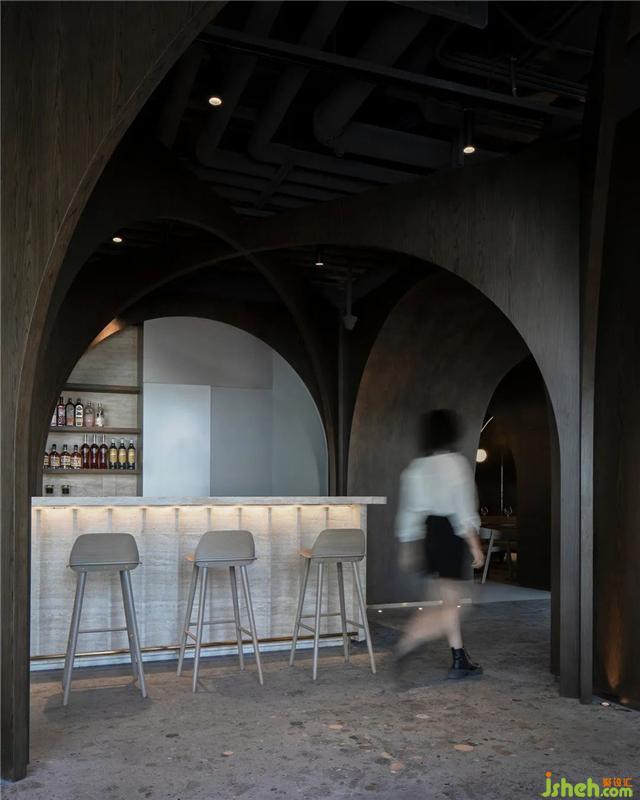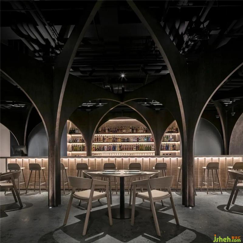 洞石吧台、金属墙面、石材地面、木饰拱架,各种材质在灯光设计的衬托下相得益彰北京酒吧餐厅设计。
