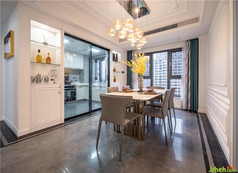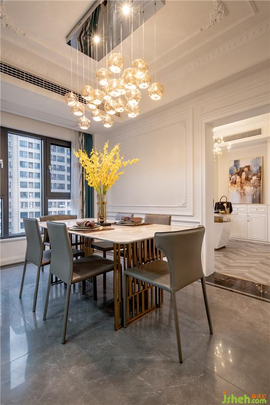 餐厅不再需要传统的边吊和射灯,如梦幻泡沫般的玻璃艺术吊灯,一样可以满足空间照明,日落黄昏时的晚餐会更显得有浪漫情调,嫩灰色的餐椅、亮黄色的花卉。地面选用灰度太阳石系列瓷砖,搭配经典黑大理石瓷砖走