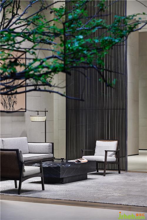 地下一层接待厅容仪端然,前台以青铜瘦竹为屏,以当代的形式,转化为空间的艺术感染力,予人舒朗身心的氛围南京售楼处设计。场域中间圆盘的置入令规整方正的接待厅增添一抹灵动,营造出悠远空灵的中式意境,尘嚣俱抛。