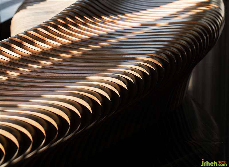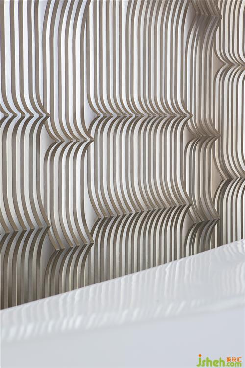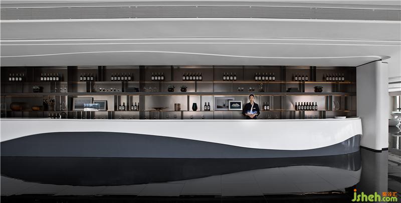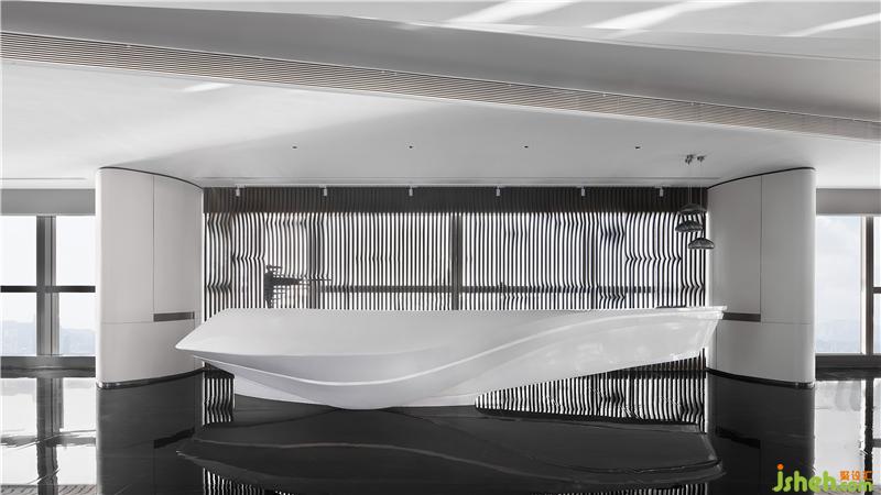 前厅的构思秉承「少即是多」的建筑设计哲学。接待台面模拟出海面波动的自然纹理,背景以海浪形意的栅格融入空间,与户外的海面景观内外映合,虚实之间构筑出空间的灵动感,空间通过设计相谐共生,达到彼此依赖的状态。