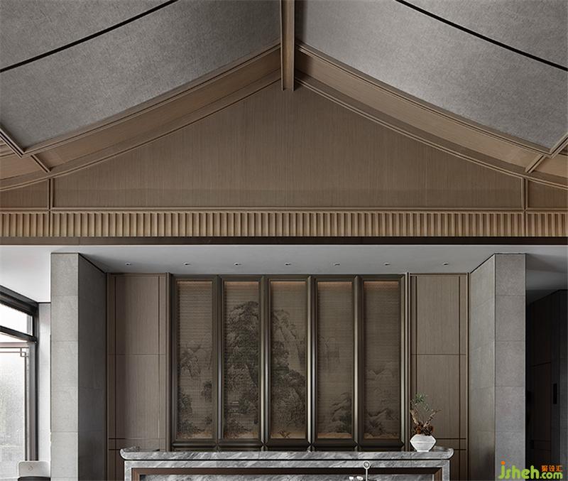 沙盘区上方采用中国传统的坡屋顶元素,用现代手法进行重构,展现了传统与现代设计的共鸣。透过木色线条格栅,材质与光影的动态产生交互,凝结出画面的丰盈意境。