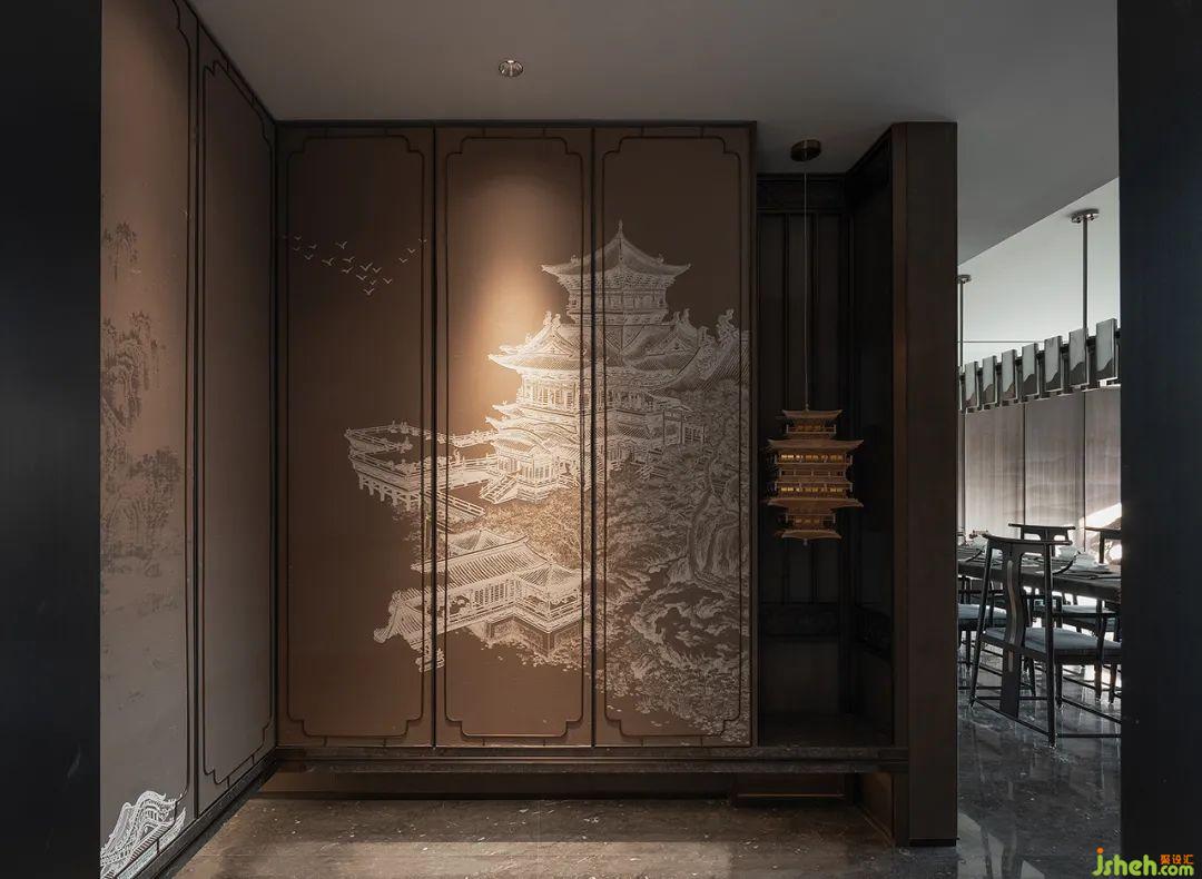 初入玄关,一副清朝九成宫图轴将雅韵的东方艺术气息引入室内。华灯初上,介于方寸之间,尽享乾坤,以此体现传统住宅建筑“藏风纳气”的居住理念。