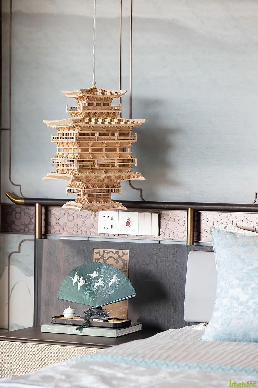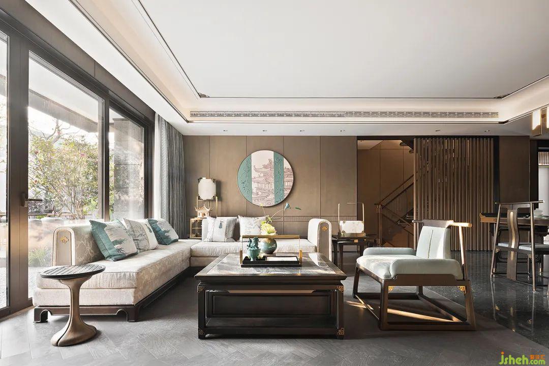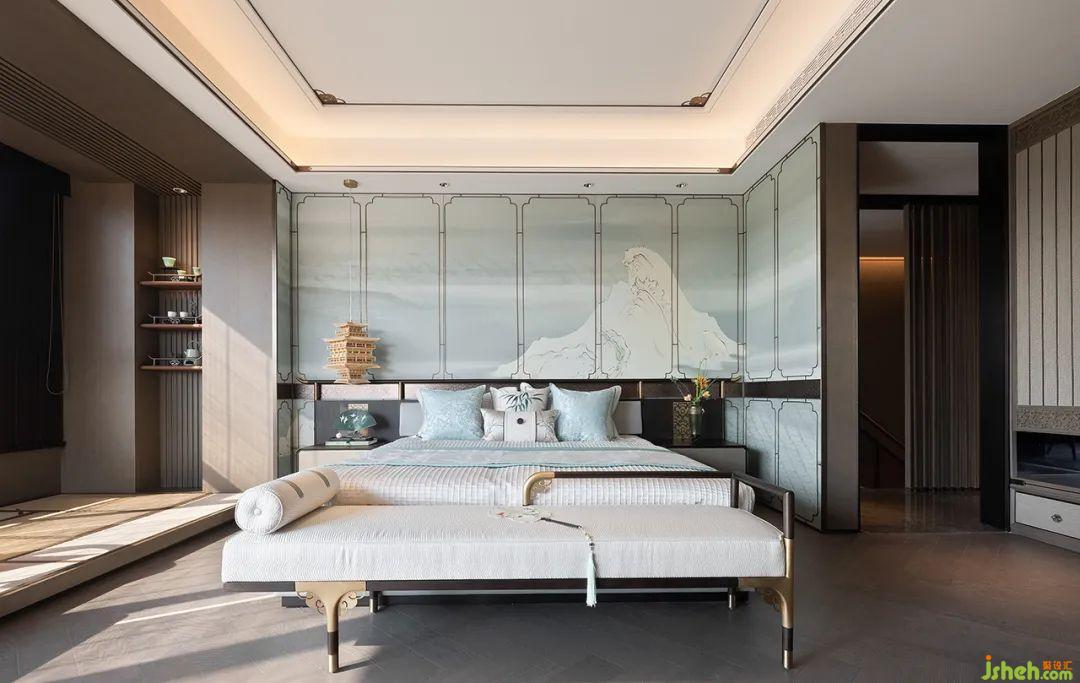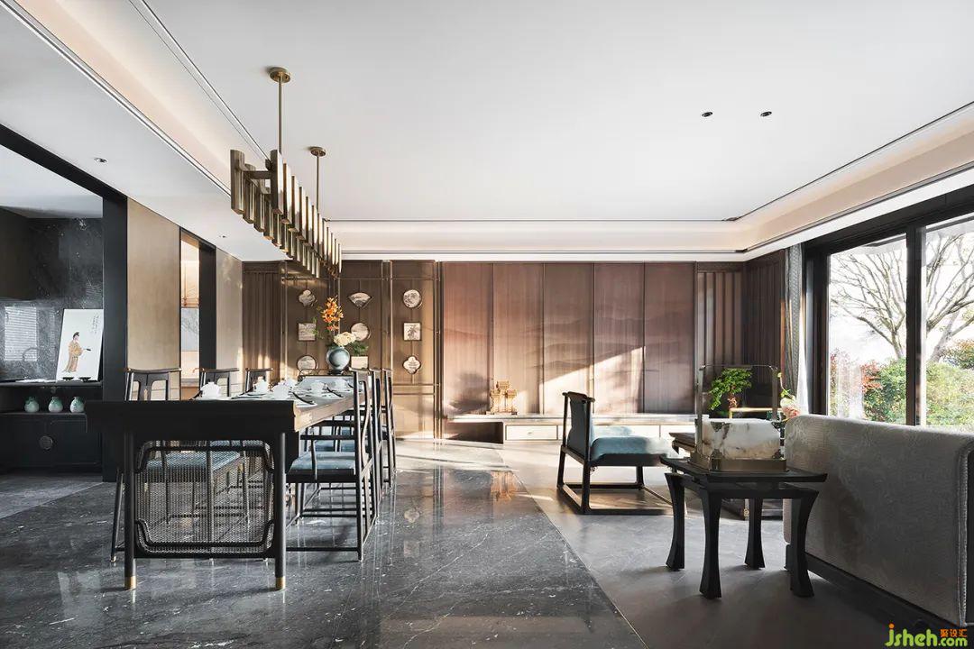 踏入室内,映入眼帘的是大幅飘窗打通室内与户外景致的视觉联结使之更加开敞,和煦日光,将清幽写意娓娓道来。室内设计整体为王府中式设计,不经意间将生活、诗,远方连成一体,召唤每一位归家的人。室内整体采用中式元素融入考究而克制的细节,客厅背景金属网,在里面加上了一副娟丝雕刻的山水画,其渗透出的远山层叠与金属质感的动静相衬,赋予流动的语言,增添不同层次的感官体验,让其形成虚与实的中式意境。