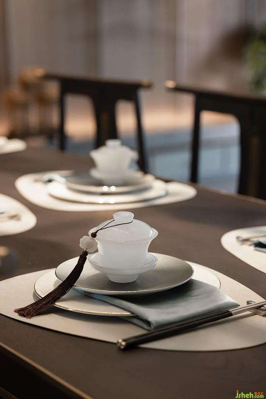 餐厅与客厅分而不割,互相渗透,在自由的空间中形成家庭社交空间。无隔断设计使空间关系更紧密,生活场景丰富多彩,带给一家人舒适优雅的用餐环境与社交体验。陈设以“陶都文化”融汇美好器物延展营构空间,呈现风雅东方诗意生活。