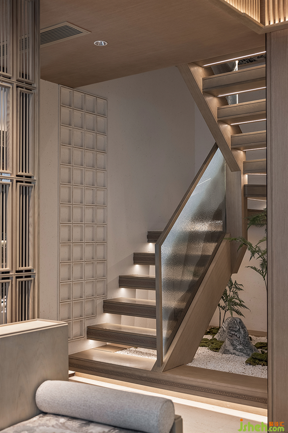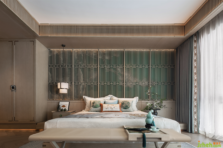 二层主卧延续整体室内空间的设计基调,清雅韵味。样板房设计卧室撷取清雅碧玉糅合点缀,温度与质感并存,以含蓄的现代方式诠释东方意境,陈设置景,简凝诗意。