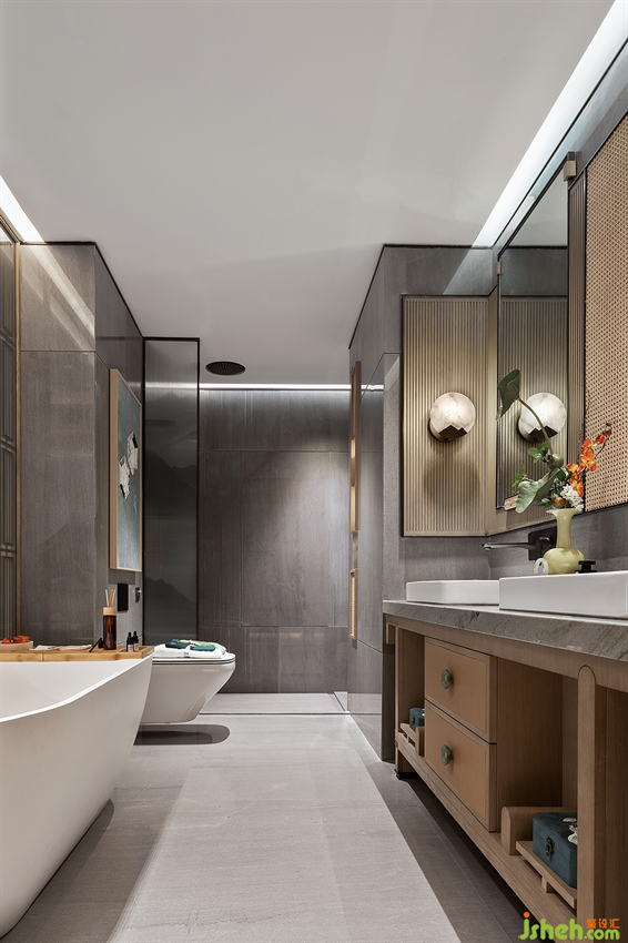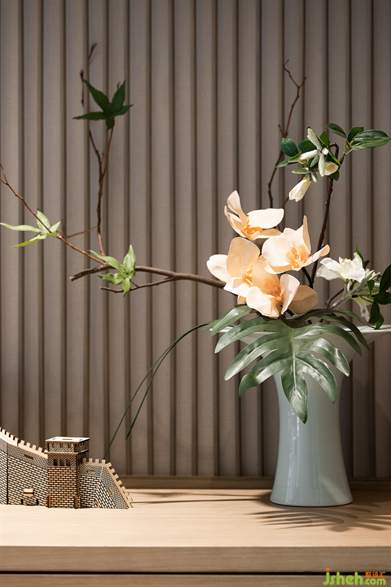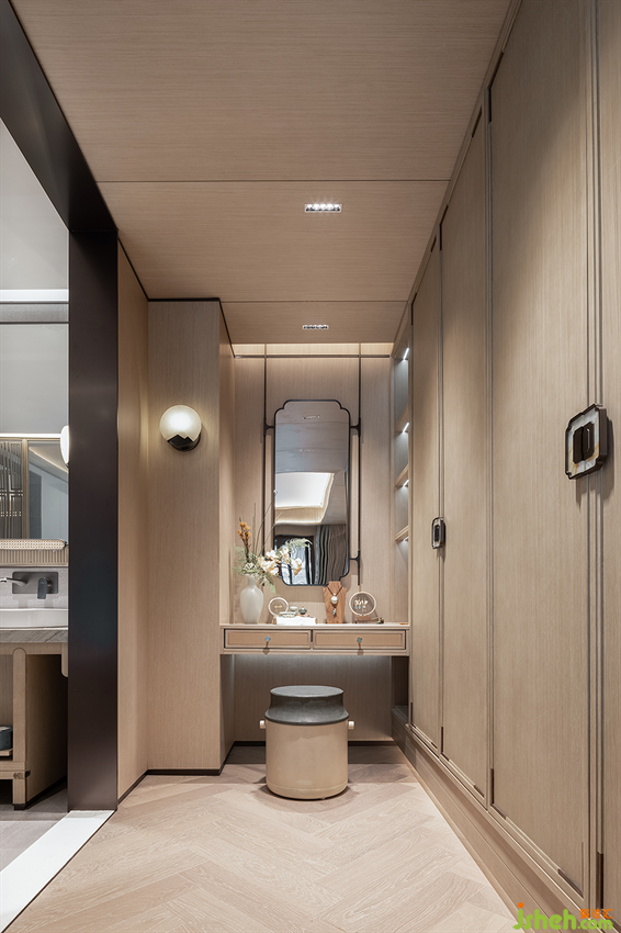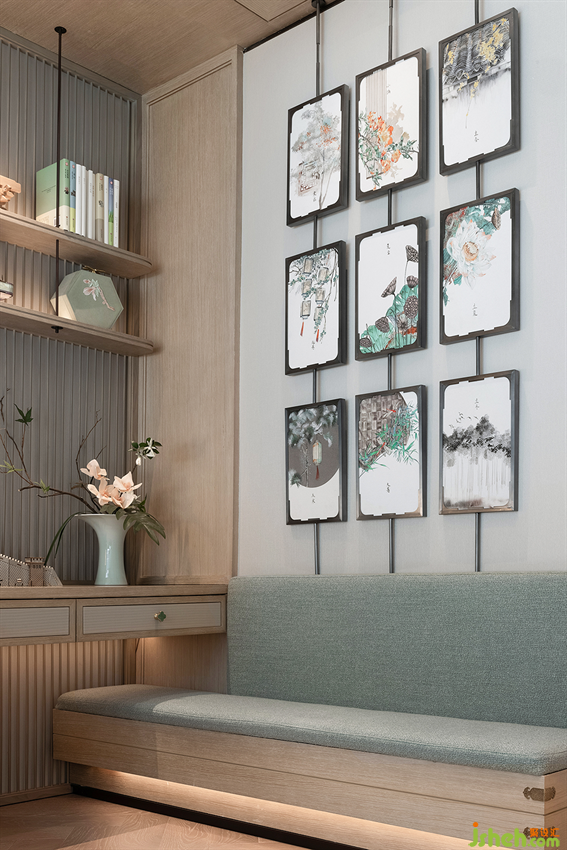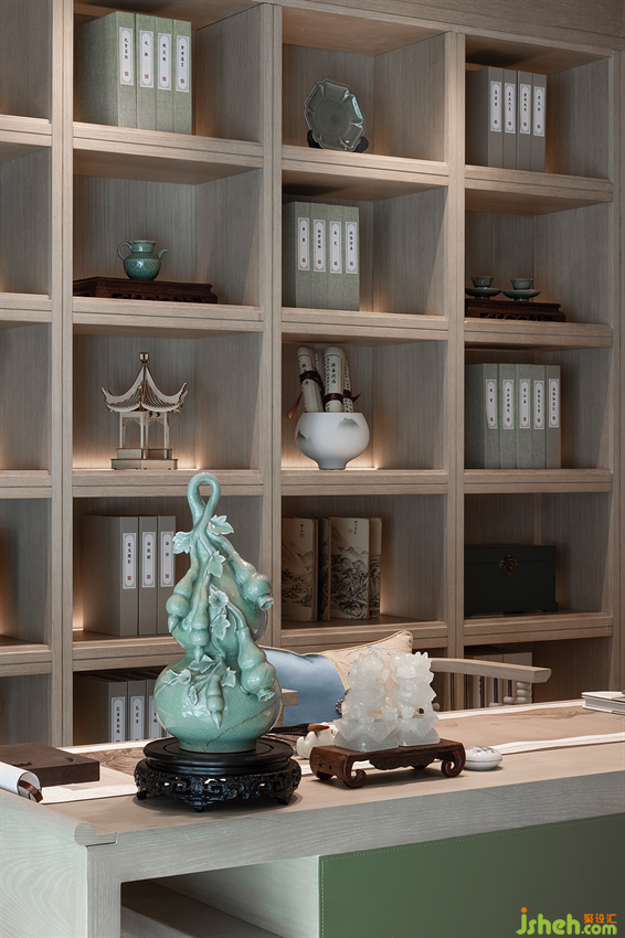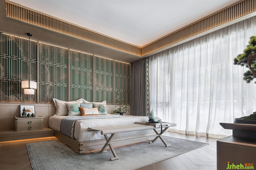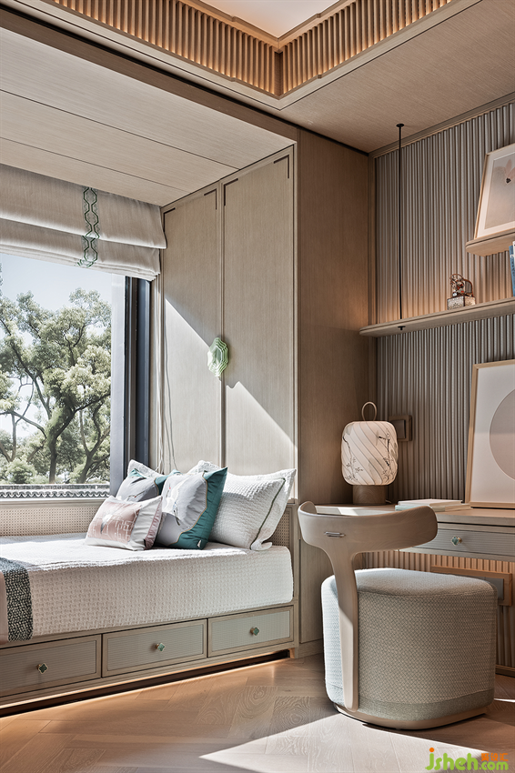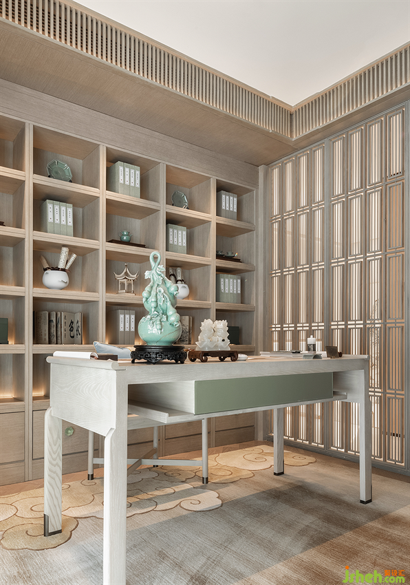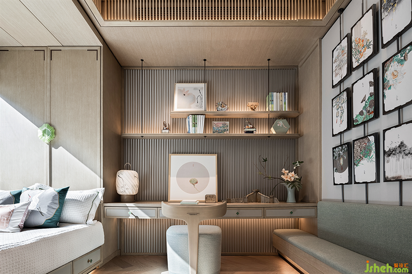 闲来看树影斑驳,书卷满架。样板房设计主卧与书房的组合儒道并蓄,动静相蕴,与空间意境相互呼应孕育出禅意之风,契合中和雅正之美。