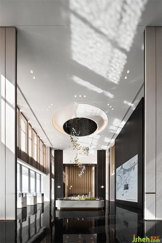 沙盘区域的流线天花吊灯引入眼帘,如同优雅的鸟群,漩涡于空中飞翔,让空间在视觉上彰显灵动,赋予生命力,同时呈现现代空间的艺术美学格调。