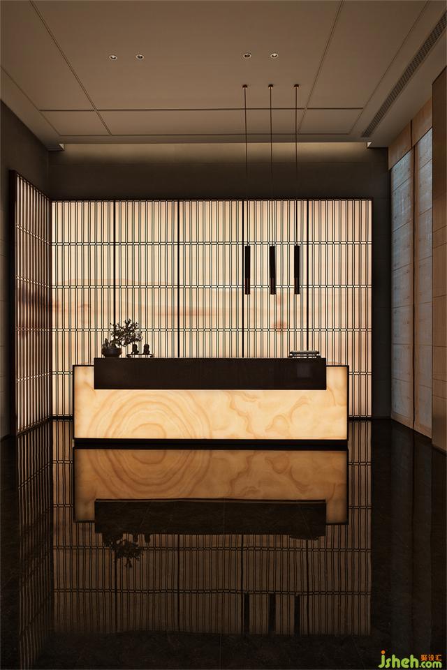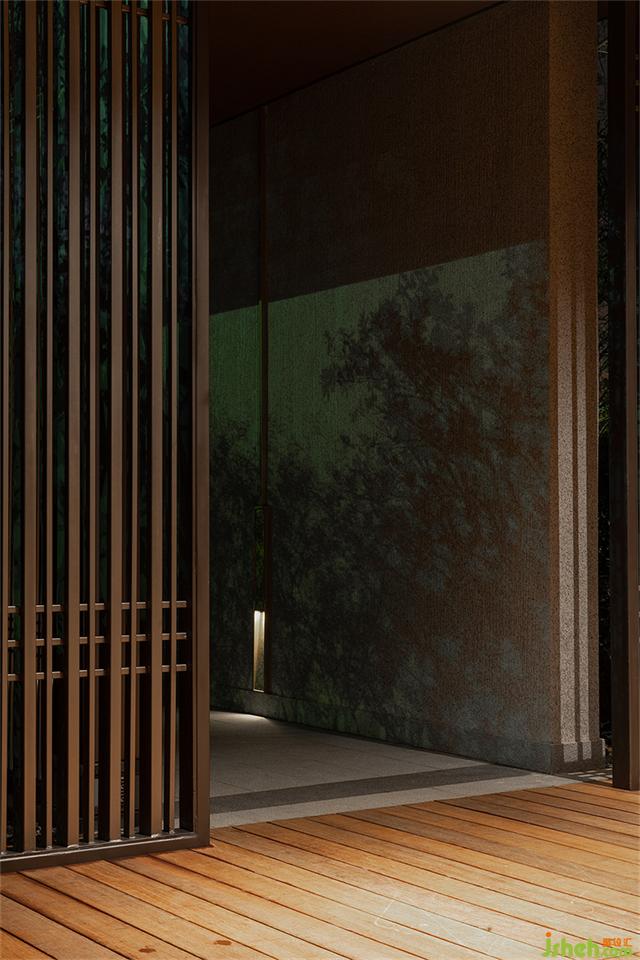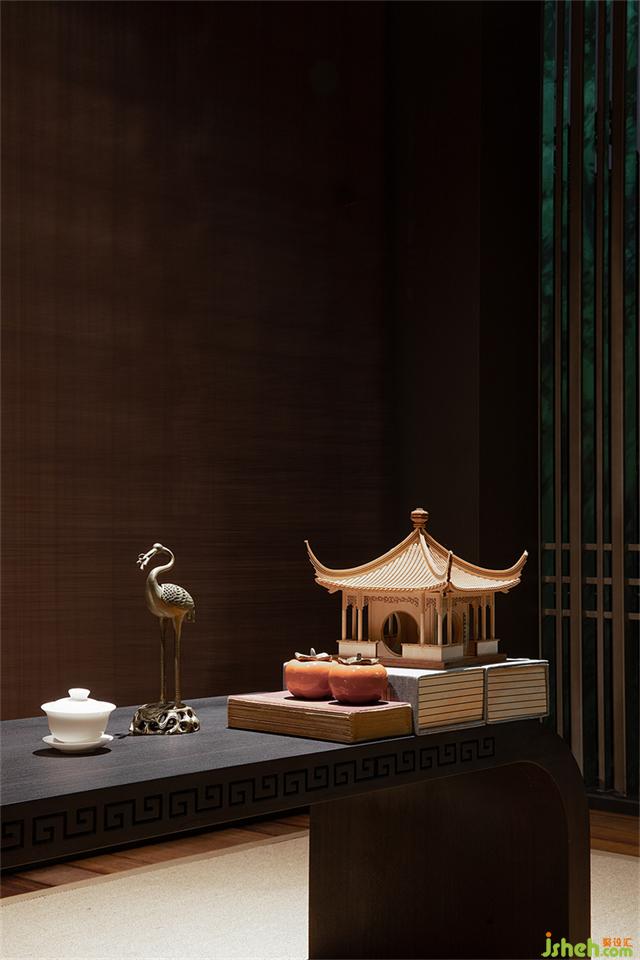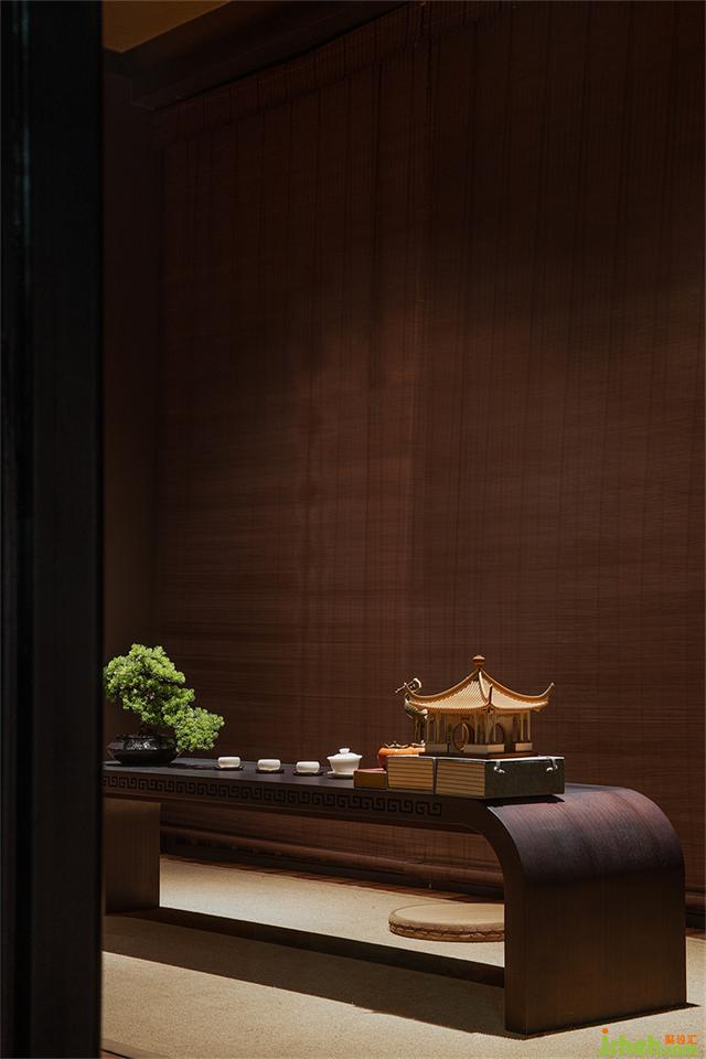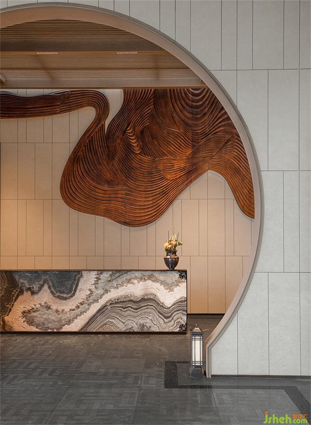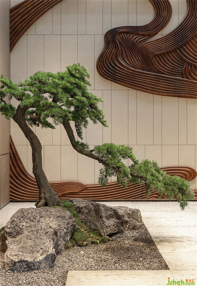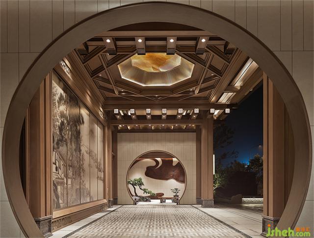 月洞门圆润如月,暗含九九归一寓意圆满之意。营销中心设计师运用黄金分割的手法将月洞门与整个墙体的内面进行组合、切割,以虚实结合的手法营造一个半围合的空间,让静止的空间内充满灵动的柔美。一枝松枝横斜,树影婆娑构出“明月松间照”的诗意画面。