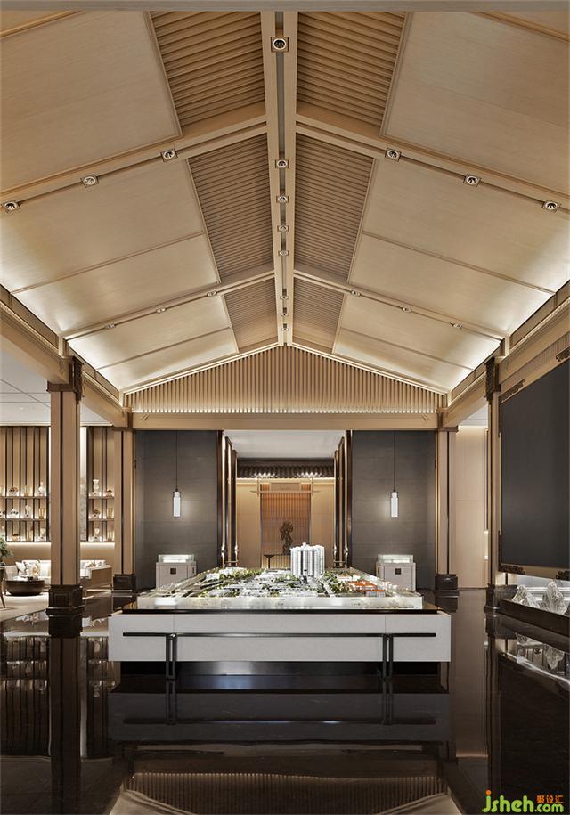 沙盘区上方采用中国传统的坡屋顶元素,用现代手法进行重构,营销中心设计展现了传统与现代设计的共鸣,创造出一种包含着能量的“场域”。